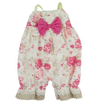 She's oh so precious in this Haute Baby "English Rose" Bubble Romper. Romper is 100% cotton and features an all over floral pattern of hot and pastel pink roses. Muted green petals are all around and lime green straps (not shown on model) cross over in the back and add a punch of color along with the big hot pink bow in the front of the bodice.