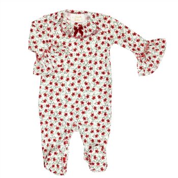 Here's an adorable footie for your newborn or infant that's perfect for the holidays and thereafter. This "Holly Jolly" floral footie by Haute Baby features red flowers with green leaves on a white background.