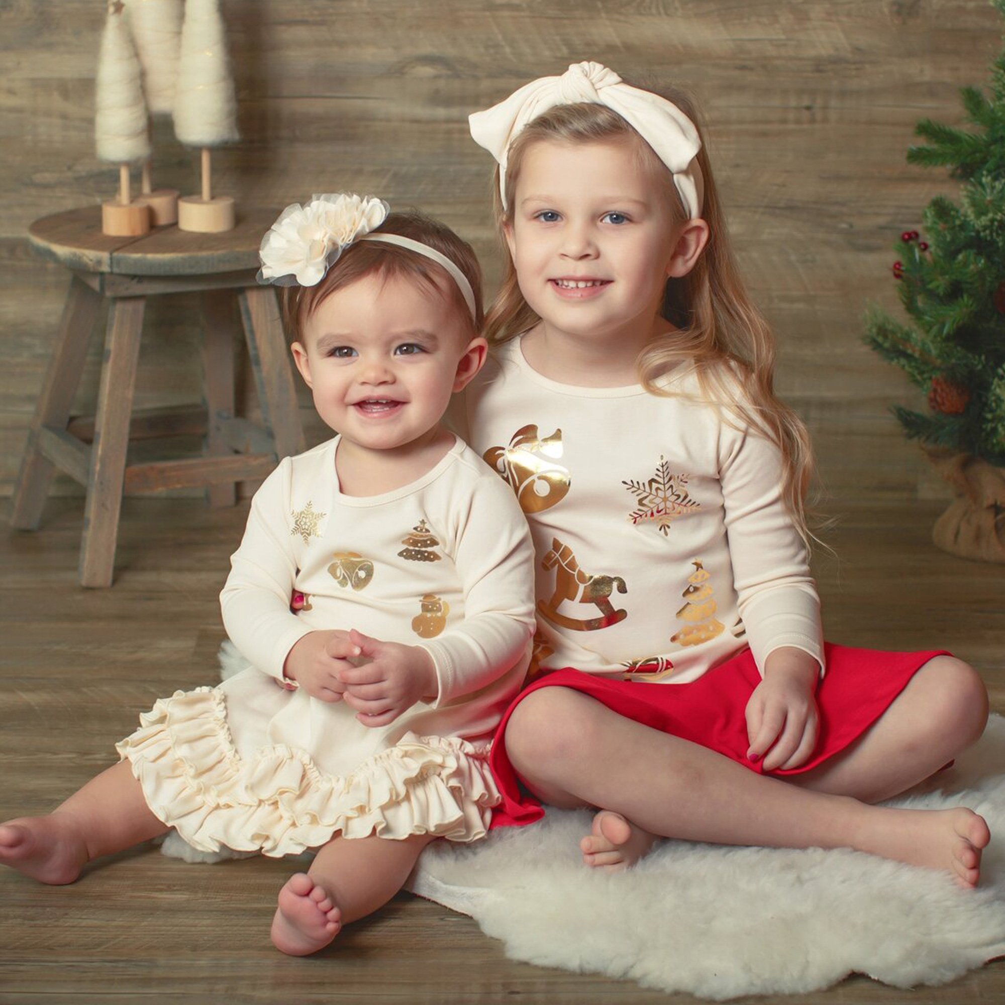 Just perfect for holiday photos and get togethers with family and friends. Consider pairing with the Lemon Loves Layette eggnog bow headband as shown in the photo.