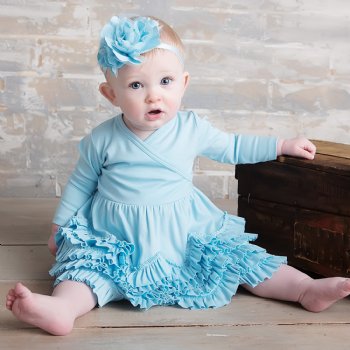 This "Jada" dress  by Lemon Loves Layette in Cinderella blue will make your little princess the belle of the ball! It's made of 100% cotton that is so soft against baby's skin. The bodice is a cross over front and then cascades to 5 layers of precious ruffles.  A great winter wonderland color of "Frozen" blue that's just perfect for the holidays, too!